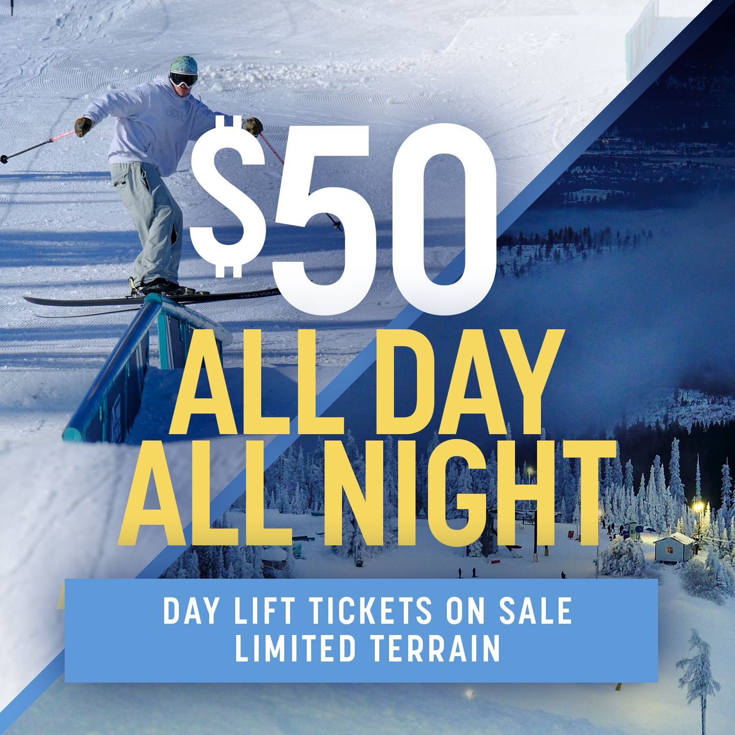 Night ski can be affected by temperatures and conditions. Always check our conditions update and schedule before coming to the mountain. No other discounts apply to night ski tickets.
