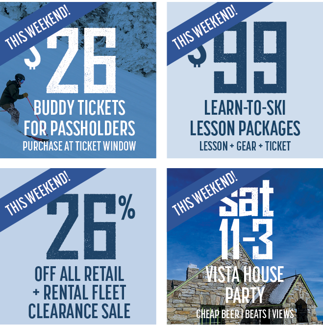 Cheap beer. Hot dogs. DJ. And the best people around. - Season Pass Holder Buddy Weekend – Bring friends for $26 lift tickets. Show your pass at ticket window for discount.